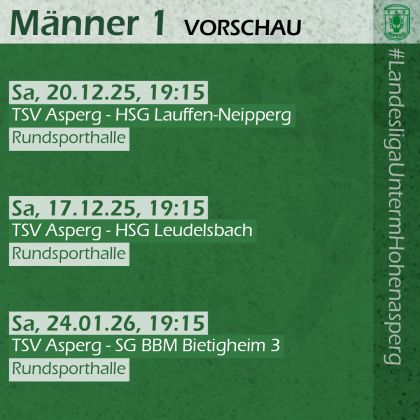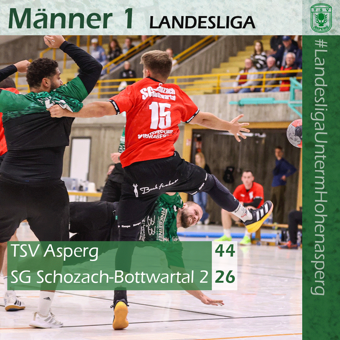 Die erste Männermannschaft bleibt auch nach dem zehnten Spieltag ohne Minuspunkt, als einziges Team aller acht Landesliga-Staffeln. Im ersten Heimspiel nach vier Wochen gewinnt der TSV gegen die SG Schozach-Bottwartal 2 locker mit 44:26.