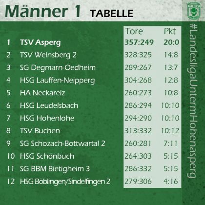 Die Lage in der Liga: Der Vorsprung der Asperger an der Tabellenspitze wächst weiter an. Während die SG Degmarn-Oedheim an diesem Wochenende spielfrei war, musste der TSV Weinsberg 2 eine überraschende Niederlage hinnehmen. Beim Schlusslicht HSG Böblingen/Sindelfingen 2 stand es am Ende 32:21. Einen Sprung nach oben hat die HSG Leudelsbach gemacht, die sich mit 37:33 gegen die HSG Hohenlohe durchgesetzt hat. Der kommende Asperger Gegner HSG Lauffen-Neipperg rangiert nach dem 27:19-Sieg bei der HSG Schönbuch jetzt auf Platz vier. Den Spieltag abgeschlossen hat die HA Neckarelz mit dem 41:27-Sieg gegen die SG BBM Bietigheim 3, der sie auf Platz fünf bringt.