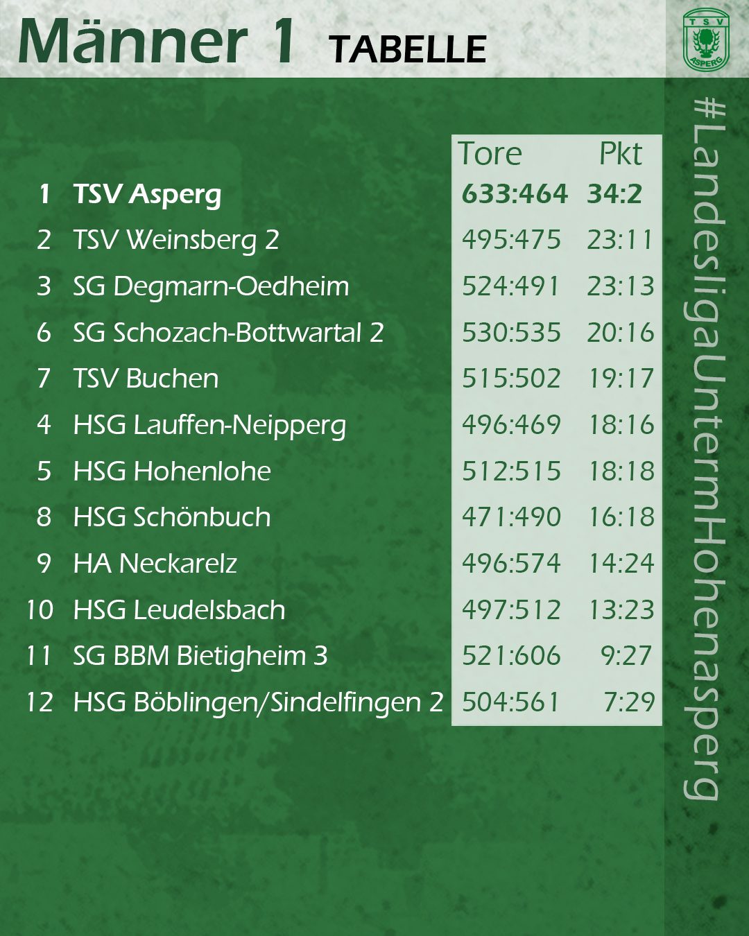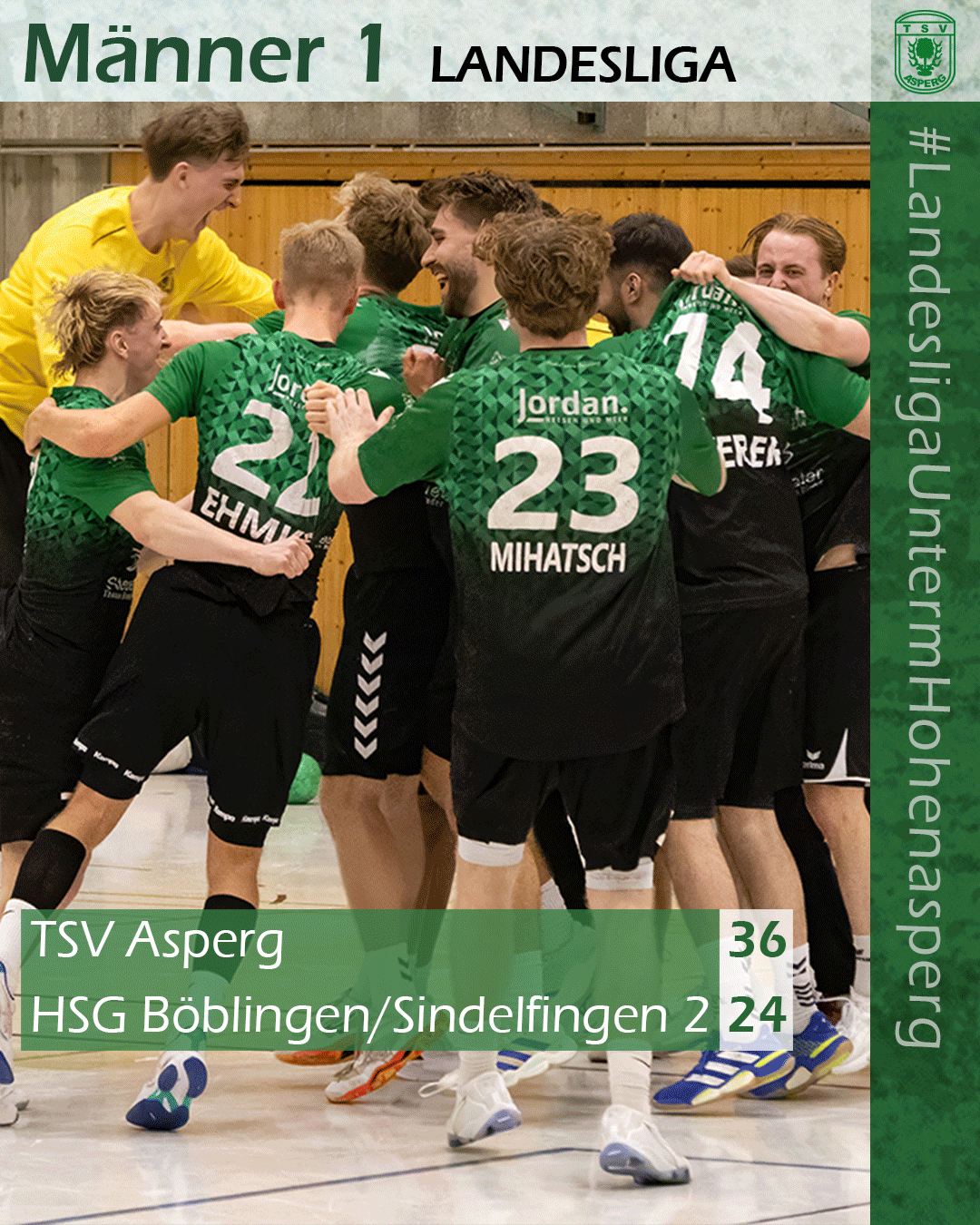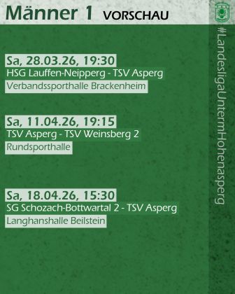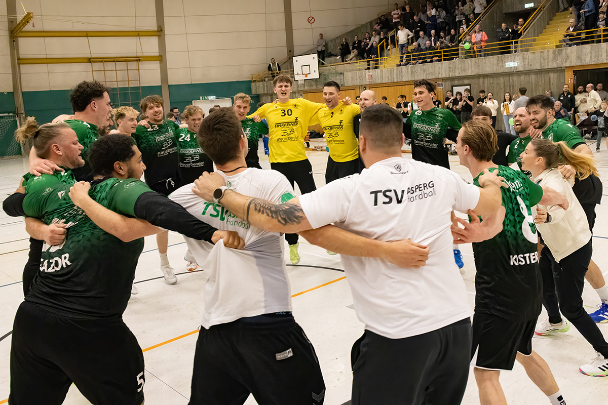 Und diese Vorbereitungen wurden in der Anfangsphase des zweiten Durchgangs nochmal intensiviert, denn der Sieg war zu keiner Zeit mehr in Gefahr, auch wenn sich die Torhüter auf beiden Seiten immer wieder bei Siebenmeter-Duellen beweisen konnten. Alleine in den ersten fünf Minuten nach Wiederanpfiff konnten Jan Gebauer, der nun das Asperger Tor hütete, und sein Pendant auf HSG-Seite drei Strafwürfe parieren. Im gesamten Spiel fanden sieben Würfe vom Siebenmeterstrich nicht den Weg ins Tor. Das sollte am Spielverlauf nichts mehr ändern. Näher als beim 27:18 in der 44. Minute kamen die sich nie aufgebenden Gäste nicht mehr heran. Neben Jan Gebauer zeigte ein weiterer Asperger Youngster, wie wichtig er für den TSV ist: Jan Raiser, mit acht Treffern der Toptorschütze. Einmal mehr war es mit zehn weiteren Spielern in der Torschützenliste aber wieder eine starke Mannschaftsleistung, die letztlich zu einem ungefährdeten 36:24-Erfolg führte.