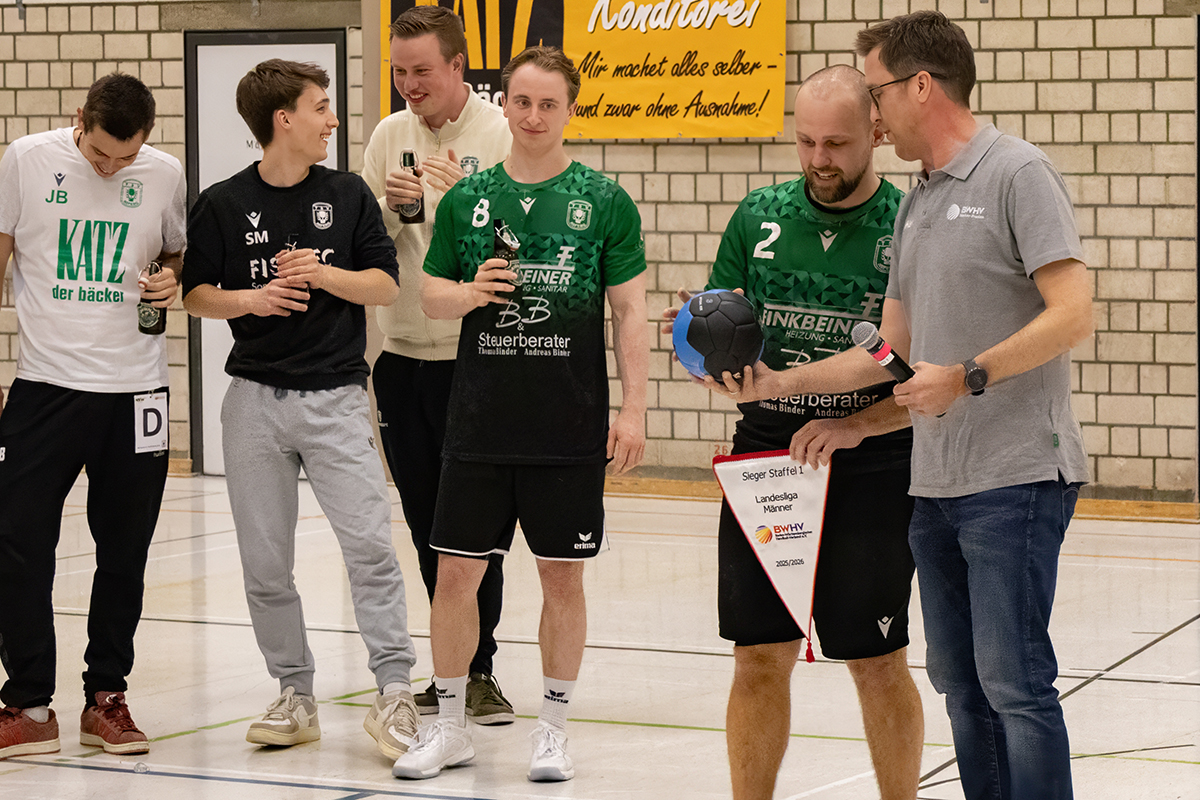 Es war angerichtet. Ein Sieg gegen den Tabellenzwölften HSG Böblingen/Sindelfingen 2 am Samstagabend und der Staffelsieg und Aufstieg in die Verbandsliga sind sicher. Und die Männer 1 haben geliefert. Der Heimsieg war nie gefährdet und fiel mit 36:24 einmal mehr deutlich aus. Mit der Übergabe des Meisterwimpels starteten die Feierlichkeiten in der Rundsporthalle.