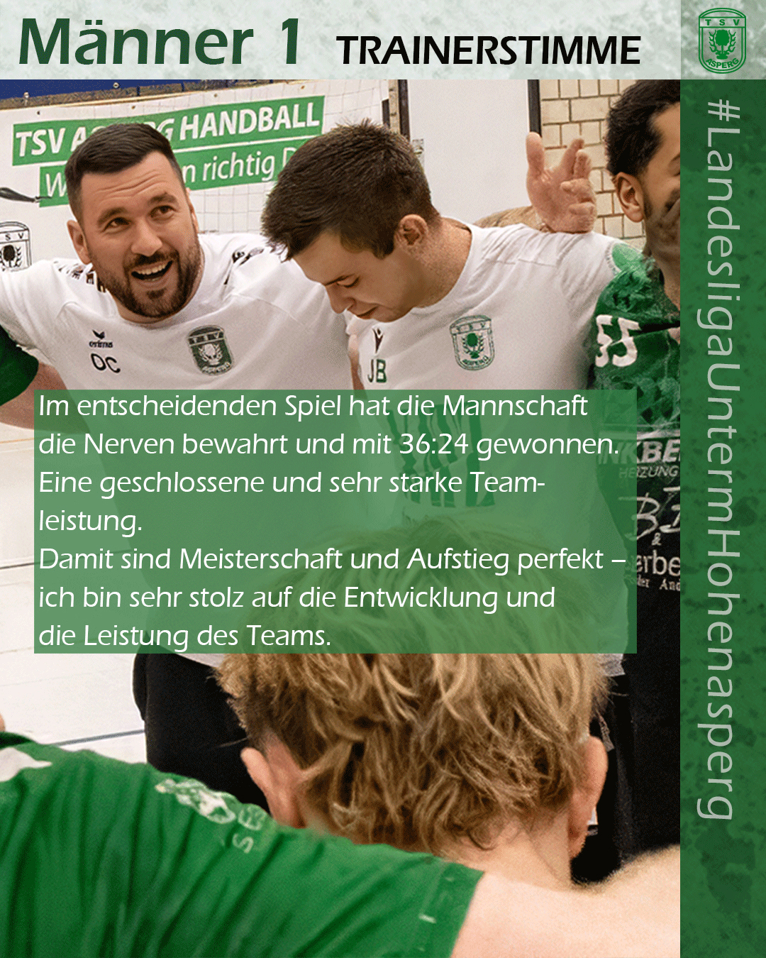Fazit des Trainers: „Im entscheidenden Spiel hat die Mannschaft die Nerven bewahrt und mit 36:24 gewonnen. Eine geschlossene und sehr starke Teamleistung. Damit sind Meisterschaft und Aufstieg perfekt – ich bin sehr stolz auf die Entwicklung und die Leistung des Teams.“