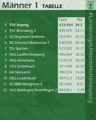 Die Lage in der Liga: Der TSV Buchen konnte einen weiteren Schritt nach vorne machen. Durch den 30:27-Sieg gegen die HSG Lauffen-Neipperg zogen die Buchener an den Gegnern vorbei auf Platz fünf. Auf Platz vier rangiert jetzt die SG Schozach-Bottwartal 2, die mit 26:21 bei der HA Neckarelz gewann. Die HSG Schönbuch hat sich nach der Niederlage in Asperg wieder eindrucksvoll zurückgemeldet und mit 36:26 gegen die SG BBM Bietigheim 3 den nächsten Sieg eingefahren. Im Kampf um Platz zwei hat die SG Degmarn-Oedheim durch den 32:30-Erfolg gegen die HSG Hohenlohe nach Pluspunkten wieder mit dem TSV Weinsberg 2 gleichgezogen.