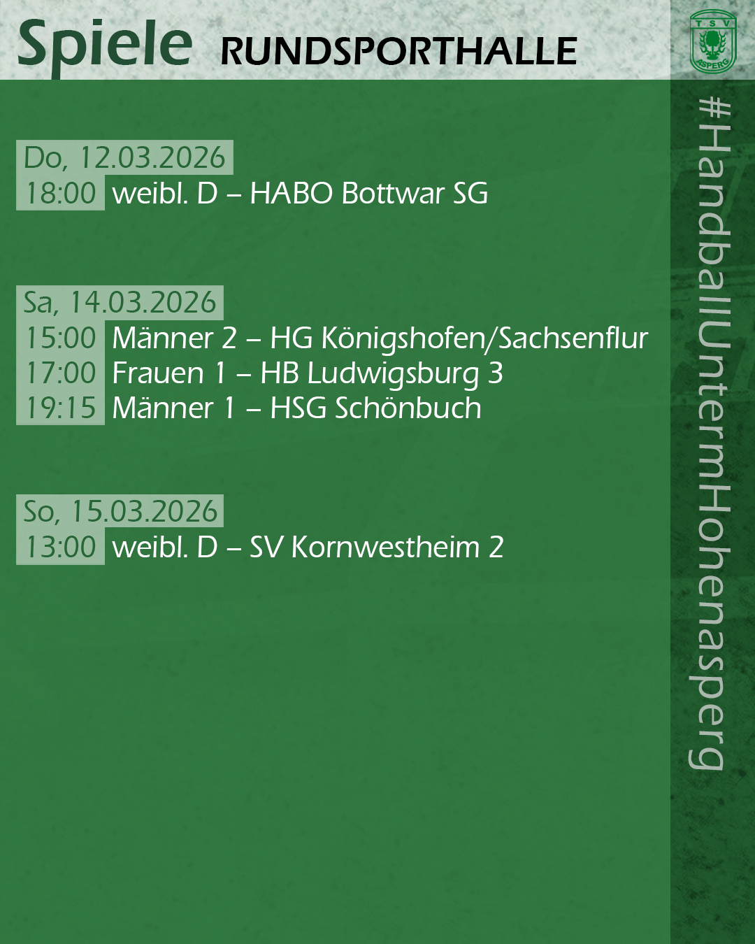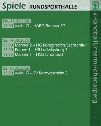 Es steht wieder ein Heimspiel-Wochenende auf dem Programm. Am Samstag sind ab 15 Uhr drei Mannschaften in der Rundsporthalle gefordert. Zunächst empfängt die zweite Männermannschaft die HG Königshofen/Sachsenflur. Um 17 Uhr ist Anpfiff für das Spiel der ersten Frauenmannschaft gegen die Dritte der HB Ludwigsburg und zum Abschluss empfangen die Männer 1 ab 19:15 Uhr die HSG Schönbuch.