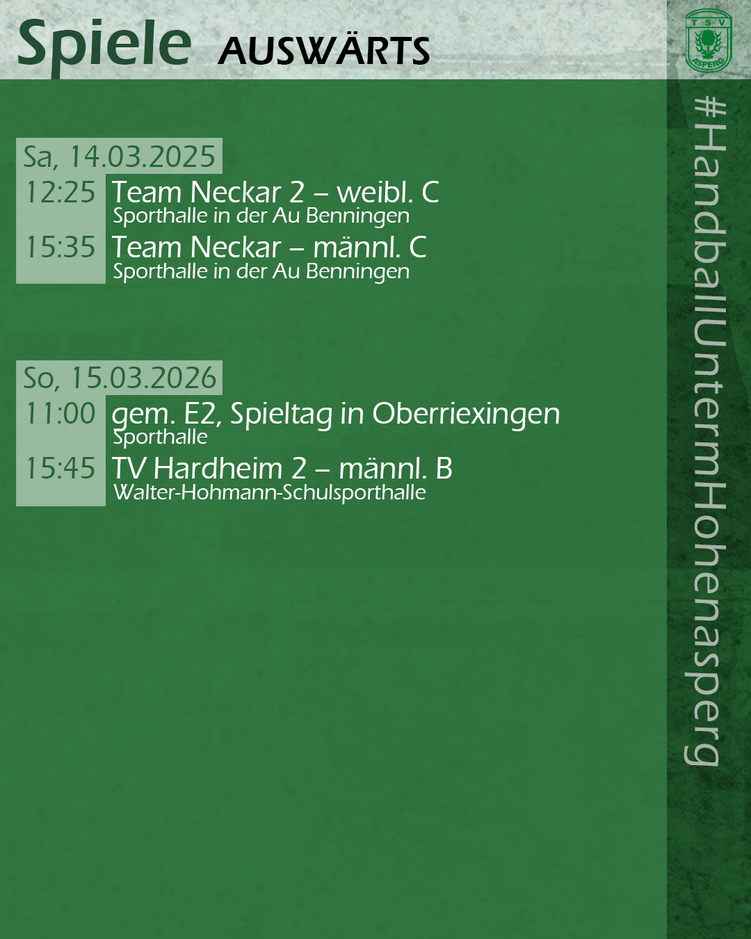 Auswärts treten am Samstag die beiden C-Jugenden beim Team Neckar an. Um 12:25 Uhr ist die weibliche C-Jugend zu Gast beim Team Neckar 2 und das Spiel der männlichen C startet um 15:35 Uhr. Spielort ist die Sporthalle in der Au in Benningen.