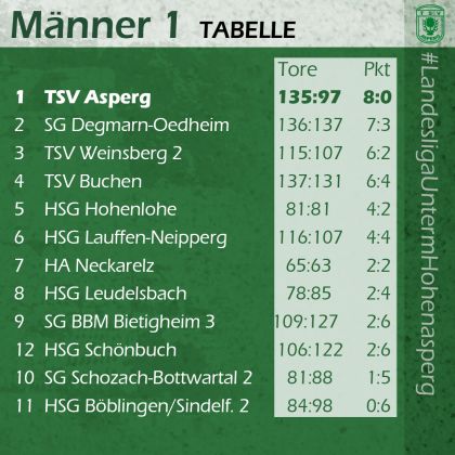 Die Lage in der Liga: Im Verfolgerduell gab es die erste Saisonniederlage für den TSV Weinsberg 2, der mit 26:24 der SG Degmarn-Oedheim unterlag. Die HSG Lauffen-Neipperg und die HSG Hohenlohe konnten mit Siegen gegen Bietigheim 3 und Böblingen/Sindelfingen 2 den Anschluss an die obere Tabellenregion halten. Mit einem Sieg in Neckarelz ist der TSV Buchen auf Platz vier geklettert. Und die HSG Schönbuch hat durch den Erfolg gegen Schozach-Bottwartal 2 das Tabellenende verlassen.