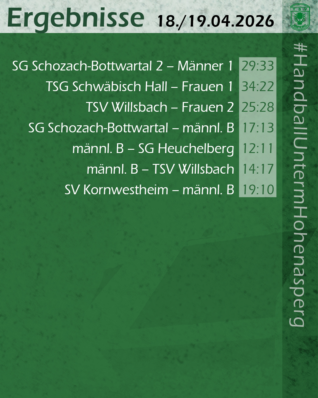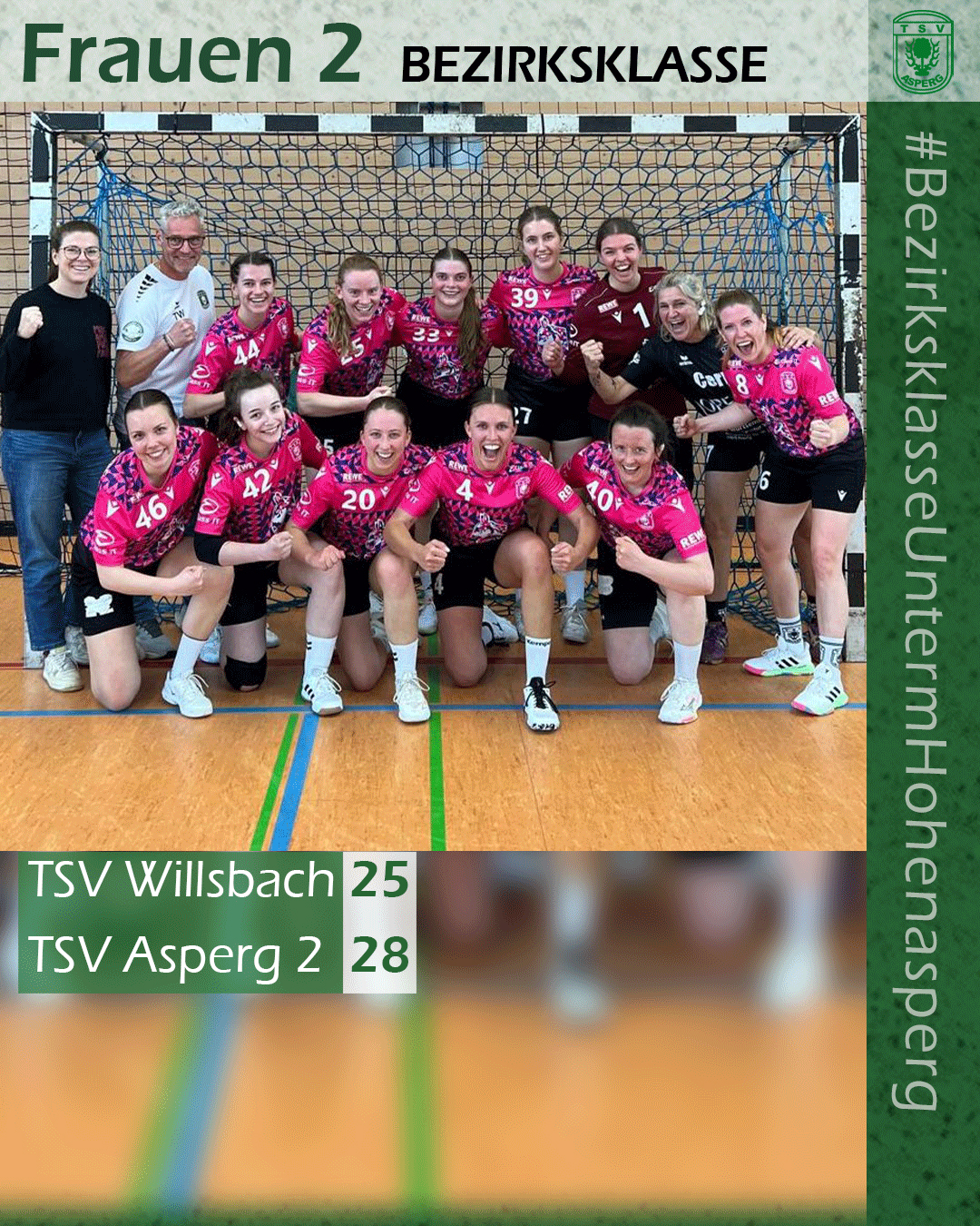 Zum Start in die zweite Halbzeit konnten die Willsbacherinnen nochmal auf zwei Treffer verkürzen (16:18; 36. Min), in der 42. Minute waren es aber wieder fünf Tore Abstand (18:23). Danach ließen die Aspergerinnen nichts mehr anbrennen und fuhren mit 28:25 den nächsten Sieg ein. Damit geht der TSV punktgleich mit der HSG Leudelsbach in den letzten Spieltag. Dank des gewonnenen direkten Vergleichs liegt man aber vor der HSG auf Platz zwei.