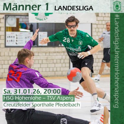Zwei Spiele sind im neuen Jahr absolviert. Für die erste Männermannschaft sprangen zwar zwei Siege gegen Leudelsbach und Bietigheim 3 heraus, es gab aber auch die Erkenntnis, dass noch nicht alles so läuft, wie man es aus der Hinrunde gewohnt war. Nach den zwei Auftritten in der Rundsporthalle geht es am kommenden Samstag erstmals im Jahr 2026 in die Fremde. In der Creutzfelder Sporthalle in Pfedelbach erwartet die HSG Hohenlohe das Cicione-Team. Die HSG hat bisher eine ausgeglichene Saison hinter sich. Seit dem 35:21 im Hinspiel stehen fünf Siege und fünf Niederlagen zu Buche. Damit rangieren die Hohenloher auf dem sechsten Platz. Für Asperg gilt es vor allem die Abwehr zu stabilisieren, um den dritten Sieg des Jahres einzufahren und weiter als einziges Landesligateam ohne Minuspunkte zu bleiben. Das Team freut sich über zahlreiche Unterstützung am Samstag ab 20 Uhr in Pfedelbach.