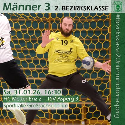 Nachdem das Spiel am vergangenen Wochenende ausgefallen ist und durch ein teaminternes Fußballspiel ersetzt wurde, geht es am Samstag für die dritte Männermannschaft in der 2. Bezirksklasse weiter. Der Tabellenführer ist ab 16:30 Uhr zu Gast beim Tabellendritten HC Metter-Enz 2. Das Spiel in der Hinrunde war in der ersten Halbzeit noch ausgeglichen, im zweiten Durchgang waren die Asperger überlegen und setzten sich mit 34:26 durch.