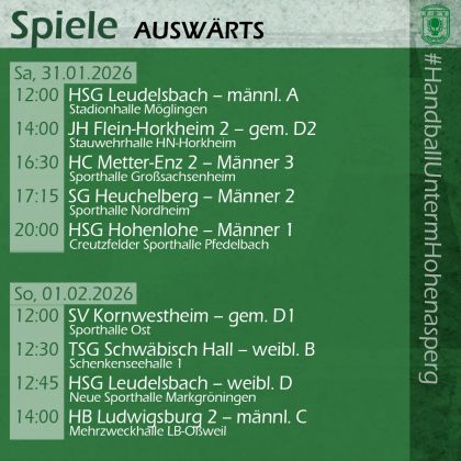 Für die Männer 1 geht es um 20 Uhr in Pfedelbach bei der HSG Hohenlohe um den nächsten Sieg. Bei der SG Heuchelberg tritt ab 17:15 Uhr die zweite Männermannschaft an und für die Dritte steht um 16:30 Uhr das Spiel in Großsachsenheim gegen den HC Metter-Enz 2 auf dem Spielplan.
