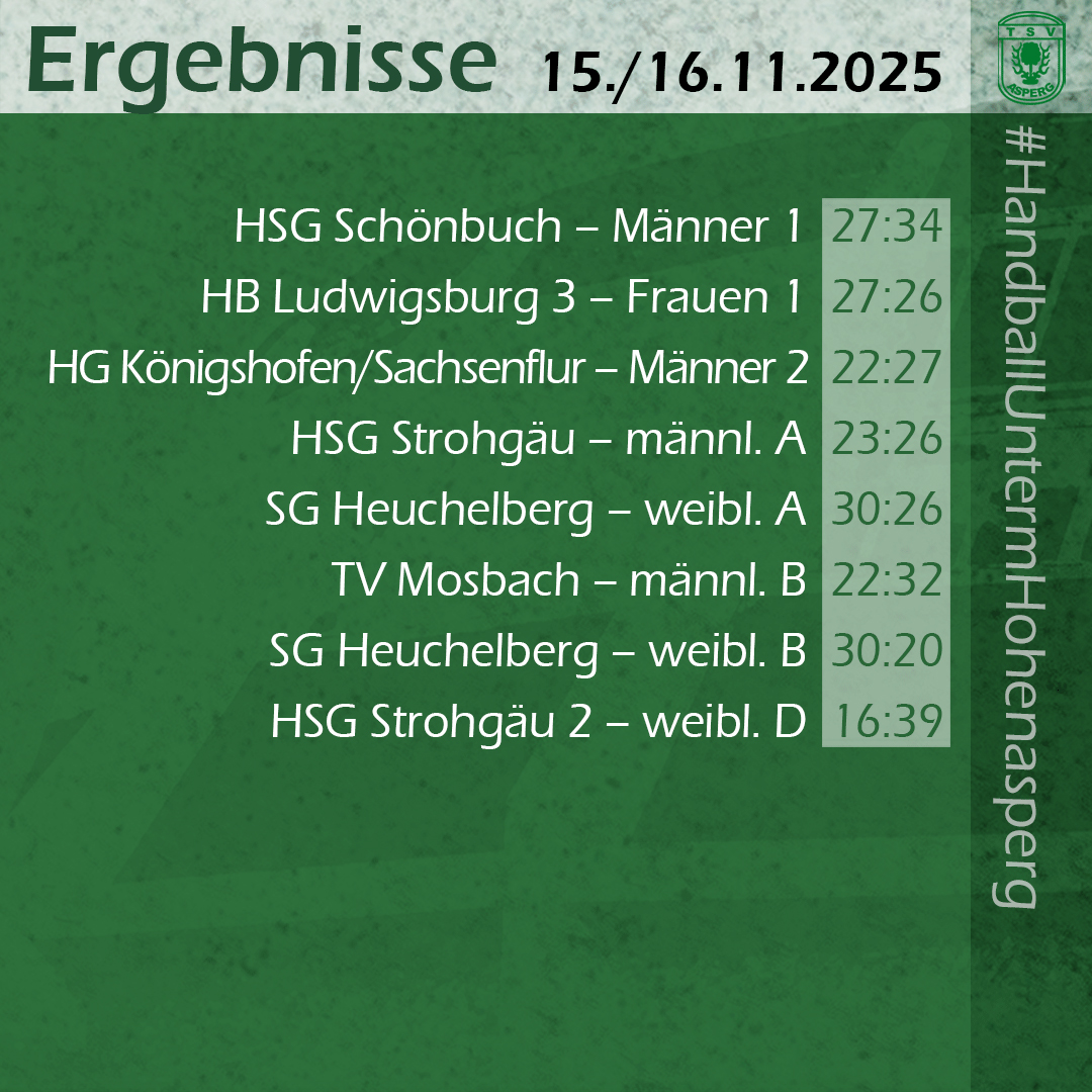 Im Jugendbereich gab es Siege und Niederlagen. Erfolgreich waren die männliche A mit 26:23 bei der HSG Strohgäu, die männliche B mit 32:22 beim TV Mosbach und die weibliche D-Jugend mit 39:16 bei Strohgäu 2. Für die weibliche A- und B-Jugend war die Fahrt zur SG Heuchelberg nicht von Erfolg gekrönt. Die A-Jugend unterlag mit 30:26 und die B-Jugend musste eine 30:20-Niederlage hinnehmen.