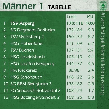 Die Lage in der Liga: Die schärfsten Verfolger des verlustpunktfreien TSV bleiben die SG Degmarn-Oedheim (9:3 Punkte), der TSV Weinsberg 2 (8:2) und die HSG Hohenlohe (6:2), die alle ihre nächsten zwei Pluspunkte einfahren konnten. Das Tabellenmittelfeld wird angeführt vom nächsten Asperger Gegner, dem TSV Buchen auf Platz fünf. Die HSG Leudelsbach klettert durch den Sieg gegen das Schlußlicht Böblingen/Sindelfingen 2 auf Platz sechs, während es für Lauffen-Neipperg und Neckarelz jeweils ein Platz nach unten ging. Bietigheim 3 und Schozach-Bottwartal 2 konnten keine Punkte im Tabellenkeller sammeln.
