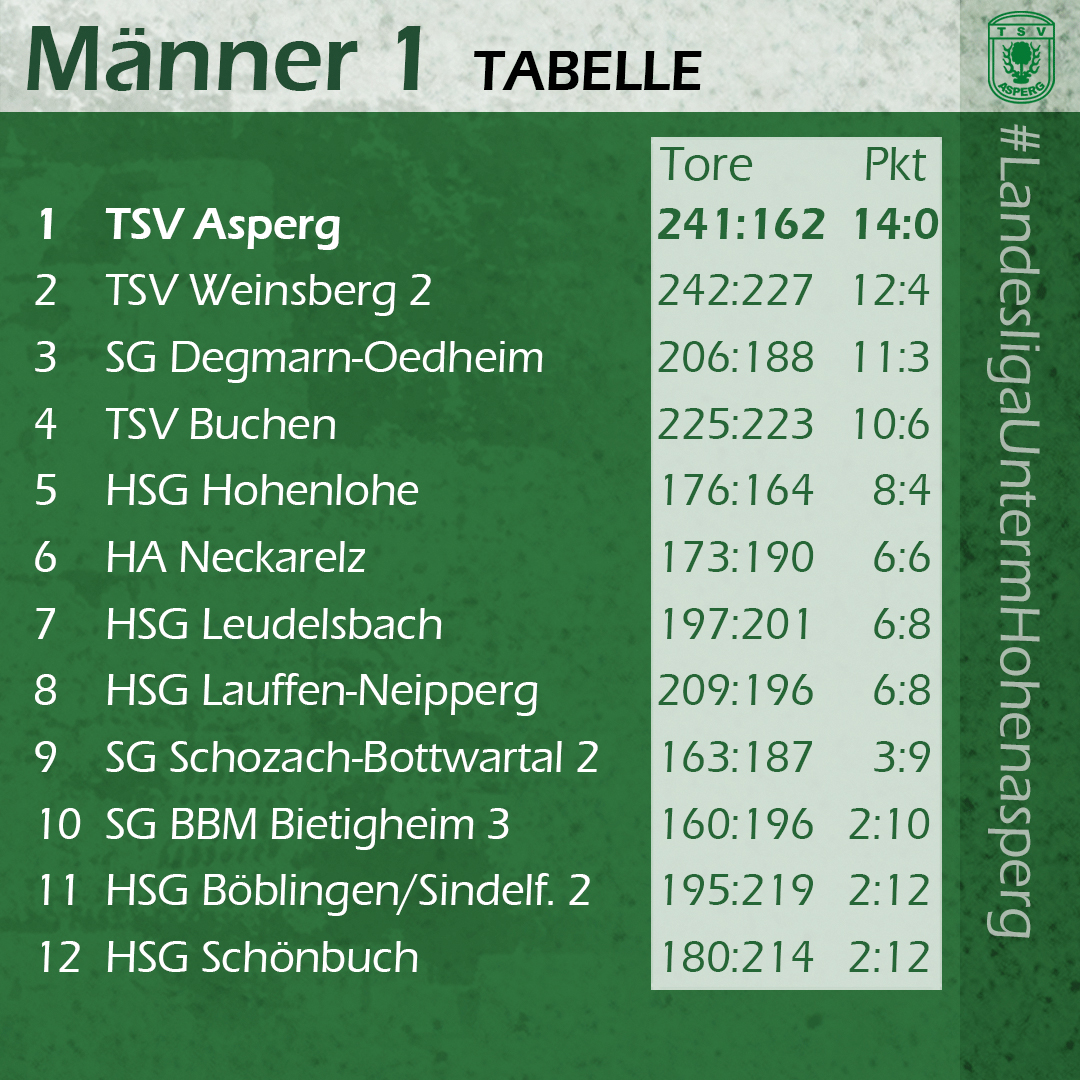 Die Lage in der Liga: Mit jetzt 14:0 Punkten hat der TSV den Vorsprung an der Tabellenspitze ausgebaut, da der TSV Weinsberg 2 gegen die HA Neckarelz eine deutliche 35:29-Niederlage hinnehmen musste. Neckarelz verbesserte sich dadurch auf Platz sieben. Der Tabellendritte SG Degmarn-Oedheim wurde gegen die SG BBM 3 mit 34:24 genauso seiner Favoritenrolle gerecht, wie der Vierte aus Buchen beim 41:32 gegen Böblingen/Sindelfingen 2. Am Sonntag konnte sich die SG Schozach-Bottwartal bei der HSG Leudelsbach mit 32:29 den ersten Saisonsieg holen und sich auf Platz neun verbessern.