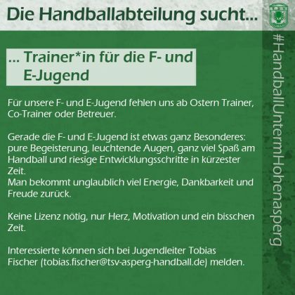 Jede Unterstützung zählt. Wer Interesse hat, sollte sich direkt bei Jugendleiter Tobias Fischer (tobias.fischer@tsv-asperg-handball.de) melden. Ostern kommt schnelle, als man denkt.