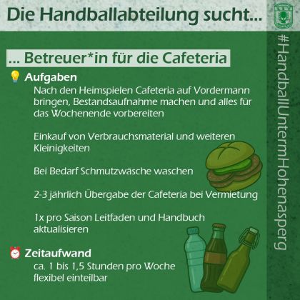 Im Schnitt jedes zweite Wochenende stehen für die Asperger Handballer Heimspiele in der Rundsporthalle an. Neben dem Spielfeld spielt sich ein großer Teil des Geschehens unter der Tribüne ab, im Eingangsbereich und in der Cafeteria. Damit auch dort alles gut abläuft, sucht die Handballabteilung zum kommenden Jahr eine/n Betreuer/in für die Cafeteria und eine/n Kassenwart/in.