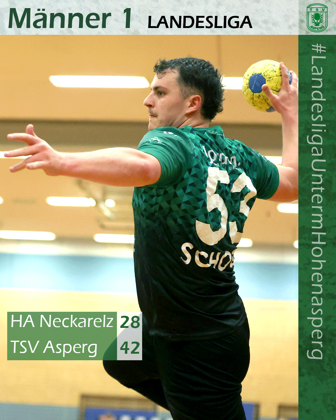 Doch dieser Trend änderte sich nach Wiederanpfiff schnell wieder. Die Asperger kamen hellwach aus der Kabine. Tim Reichert und Luis Ehmke erzielten die ersten drei Treffer des zweiten Durchgangs und erhöhten wieder auf sechs Tore Vorsprung. Der TSV war jetzt wieder richtig drin im Spiel. Tor um Tor wuchs der Vorsprung wieder an. Aus einer starken Mannschaft ragten Janik Beermünder mit acht Toren, sowie Luis Ehmke (7) und Lou Mihatsch (6) heraus, die mit dafür sorgten, dass nach einer Dreiviertelstunde erstmals ein Zehn-Tore-Vorsprung auf der Anzeigetafel stand (21:31). Anders als im ersten Durchgang blieb die Konzentration in der Schlußphase der zweiten Halbzeit hoch. Der TSV erzielte zwischen Minute 45 und 60 nochmal elf Treffer. Beim 42:28-Sieg zeigten die Asperger wieder ihre Sicherheit und Kaltschnäuzigkeit vor dem Tor und fuhren den nächsten deutlichen Sieg ein. Mit 28:2 Punkten bleibt das Team nicht nur das Maß aller Dinge in der Landesliga-Staffel 1. In den weiteren sieben Staffeln hat mit dem TSV Neuhausen/Fildern 2 nur ein weiterer Spitzenreiter ebenfalls nur eine Niederlage auf dem Konto.