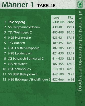 Die Lage in der Liga: Neben dem TSV Asperg konnten auch die Zweit- und Drittplatzierten ihre Spiele gewinnen. Die SG Degmarn-Oedheim gewann zuhause mit 35:31 gegen die SG Schozach-Bottwartal 2 und der TSV Weinsberg 2 besiegte die SG BBM Bietigheim 3 mit 29:27. Die HSG Hohenlohe klettert mit dem 25:19-Erfolg gegen die HSG Lauffen-Neipperg auf den vierten Platz und Schlusslicht HSG Böblingen/Sindelfingen 2 holte bei der HSG Leudelsbach einen Punkt (27:27)