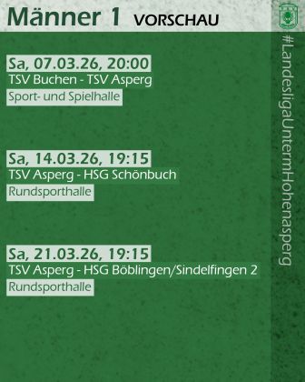 Das nächste Spiel: Ein weiteres spielfreies Wochenende steht vor den Asperger Männer 1, ehe sie am Samstag, dem 07.03. erneut auswärts antreten. Um 20 Uhr startet das Spiel beim TSV Buchen in der Sport- und Spielhalle (Buchen 1) (Dr.-Fritz-Schmitt-Ring, 74722 Buchen).