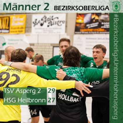 Die zweite Männermannschaft bleibt in der Rundsporthalle weiter ungeschlagen. Am Samstagabend war der bisherige Tabellenführer HSG Heilbronn zu Gast, der mit 8:2 Punkten zwei Zähler vor den Aspergern stand. Das Topspiel zeigte sich bis zum 7:6 in der 12. Minute ausgeglichen. Danach gelang es den Hausherren sich auf 10:7 abzusetzen, bis zur Pause war das Spiel aber wieder ausgeglichen: 13:13.
