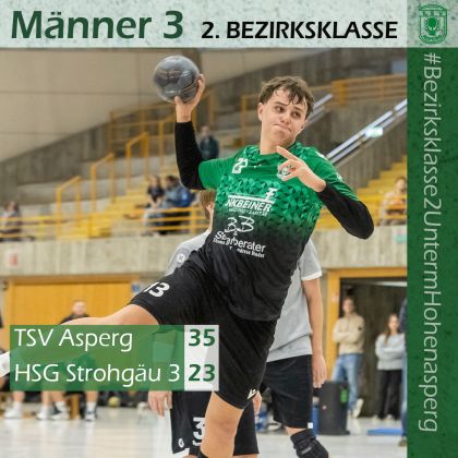 Die Männer 3 haben ihre Spitzenposition in der 2. Bezirksklasse verteidigt. Am Samstag ging es gegen die bis dato ebenfalls noch ungeschlagene HSG Strohgäu 3. Asperg zeigte von Beginn an, dass es an diesem Nachmittag nur einen Sieger geben kann. Über 5:3 und 10:6 kam die Heim-Truppe nach 30 Minuten zu einem 17:10-Vorsprung.