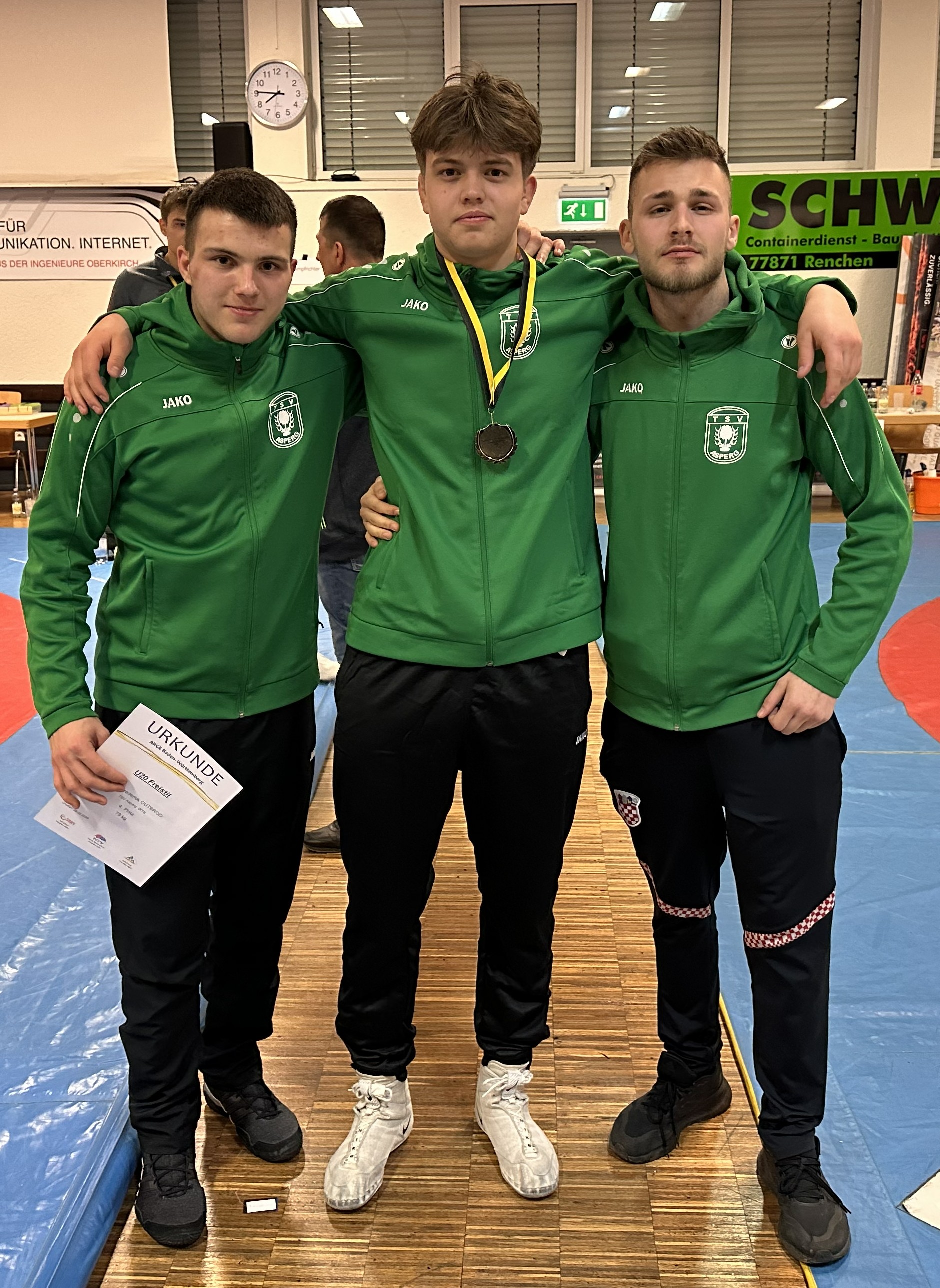 Toni hatte es in seiner stark besetzten Gewichtsklasse gleich mit 12 Gegnern zu tun. Im ersten Kampf traf er auf Jeremiah Krüger vom ASV Vörstetten. Er dominierte das Kampfgeschehen deutlich und lag bereits mit 10 zu 2 Wertungspunkten vorne, bevor er seinen Gegner auf die Schultern legen konnte und so den Kampf vorzeitig zu seinen Gunsten beendete. Gleich im zweiten Kampf traf er dann auf den favorisierten Elias Kunz vom KSC Graben-Neudorf. Toni zeigte eine beherzte Leistung, wurde aber ausgekontert und musste eine bittere Niederlage durch technische Überlegenheit hinnehmen – Elias wurde dann später auch Meister in dieser Klasse. Um wenigstens noch das kleine Finale um Platz 3 und 4 zu erreichen, musste Toni nun im nächsten Kampf den Frust über die Niederlage wegstecken und wieder volle Leistung bringen – und das tat er dann auch. Gegen Fernando Fischer Flores vom KSV Hofstetten zeigte er eine sehr kompakte Leistung. Er dominierte das Kampfgeschehen deutlich und konnte sich vorzeitig durch einen Sieg durch technische Überlegenheit mit 16 zu 5 Wertungspunkten durchsetzen. Im kleinen Finale gegen den Lokalmatador Vitalij Rosenberger vom ASV Urloffen war Toni dann aber leider chancenlos. Kurz nach der Pause konnte sich sein Gegner durch technische Überlegenheit durchsetzen und sich den begehrten Platz 3 sichern. Aber für Toni war es trotzdem ein gutes Turnier – zu Recht bekam er daher auch von den Landestrainern vom WRV eine Einladung für den Qualifikationslehrgang für die Deutschen Meisterschaften, die dann Ende März im nordrhein-westfälischen Hohenlimburg ausgetragen werden.