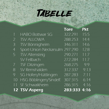 Die Lage in der Liga: Der TSV Bönnigheim hat mit dem Sieg gegen Tabellenführer Alfdorf/Lorch/Waldhausen die Tabellenspitze wieder enger zusammengerückt. Die HABO Bottwar SG fuhr gegen die SF Schwaikheim den siebten Saisonsieg und hat ALLOWA nach Pluspunkten überholt. Der nächste Gegner der Asperger, der TSV Altensteig sammelte in Neckarsulm Pluspunkt Nummer elf und zieht am SV Fellbach vorbei auf Platz fünf. In der unteren Tabellenhälfte konnte sich die SV Remshalden mit nun 9:13 Punkten einen Drei-Punkte-Polster auf die letzten drei Mannschaften erarbeiten.