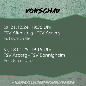 Das nächste Spiel: Zum letzten Spiel des Jahres treten die Asperger in zwei Wochen beim TSV Altensteig an. Am Samstag, dem 21.12. ist das Team in der Eichwaldhalle (Grenzweg 55, 72213 Altensteig) zu Gast. Der TSV bietet zu diesem Spiel einen Fanbus an. Treffpunkt ist um 16:30 Uhr am Lurer Platz. Anmeldungen für die Fahrt nimmt der sportliche Leiter Jens Scharfenberger telefonisch (0172/9561670) oder per Mail (jens.scharfenberger@tsv-asperg-handball.de) entgegen. Erwünscht ist eine Anmeldung bis zum 18.12.2024.