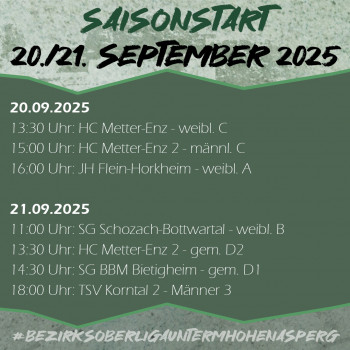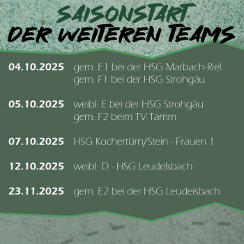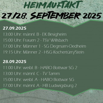 Am darauffolgenden Wochenende stehen die ersten Heimspiele auf dem Programm. Mit den Männern 1 und den beiden zweiten Mannschaften haben am Samstag, dem 27. September fast alle Erwachsenenmannschaften ihren Saisonstart. Nach dem Auftaktspiel der männlichen B-Jugend um 13 Uhr gegen EK Besigheim empfängt die zweite Frauenmannschaft den TSV Willsbach zum ersten Spiel in der Bezirksklasse (15 Uhr). Zur eher ungewohnten Heimspielzeit um 17 Uhr haben die Männer 1 zum Start in die Landesliga die SG Degmarn-Oedheim zu Gast. Den ersten Heimspieltag schließt die zweite Männermannschaft um 19:15 Uhr gegen die HSG Kochertürn/Stein ab.