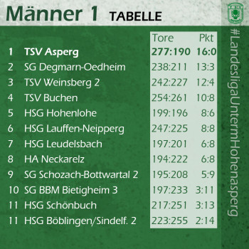 Die Lage in der Liga: Die SG Degmarn-Oedheim hat nach dem 32:23-Sieg gegen die HSG Hohenlohe nun 13:3 Punkte auf dem Konto und zeiht damit am TSV Weinsberg 2 vorbei auf den zweiten Platz. Der 38:29-Erfolg der HSG Lauffen-Neipperg gegen den TSV Buchen sorgt dafür, dass die Buchener auf Platz vier bereits acht Minuspunkte haben. Im unteren Bereich der Tabelle holte sich die SG Schozach-Bottwartal 2 mit 32:21 gegen die HA Neckarelz den zweiten Sieg in Folge und die SG BBM Bietigheim 3 und die HSG Schönbuch trennen sich 37:37.