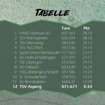 Im zweiten Durchgang war somit wieder die schon oft gezeigte Moral der Asperger gefragt. Auch die Erinnerung an das Spiel in Neckarsulm konnte helfen, wo man in der Schlußphase einen Sechs-Tore-Rückstand aufholte. Doch - ebenfalls wie schon oft in dieser Saison – kam der TSV nicht gut aus der Kabine. Fellbach konnte den Lauf weiter ausbauen und war nach 40 Minuten mit 20:28 in Front. Auch im weiteren Verlauf des Spiels schafften es die Hausherren nicht mehr den Gegner ernsthaft in Bedrängnis zu bringen. Näher als beim 29:33 in der 55. Minute kam der TSV nicht mehr ran. Am Ende stand ein deutliches 32:38 auf der Anzeigetafel der Rundsporthalle. Damit steht fest, dass der TSV den zwölften Platz nicht mehr verlassen kann und somit in der kommenden Saison wieder in der Landesliga antreten wird.