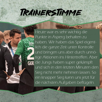 Fazit des Trainers: „Heute war es sehr wichtig die Punkte in Asperg behalten zu haben. Wir haben das Spiel eigentlich die ganze Zeit unter Kontolle und bringen uns aber durch unnötige Aktionen ins Hintertreffen. Aber die Jungs haben super gekämpft und sich in den letzten Minuten den Sieg nicht mehr nehmen lassen. So ein knapper Sieg kann uns jetzt für die nächsten Aufgaben beflügeln.“