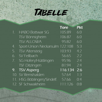 Die Lage in der Liga: Drei Mannschaften sind weiterhin ungeschlagen. Der TSV Bönnigheim, die HABO Bottwar SG und der TSV ALLOWA grüßen mit 6:0 Punkten von der Tabellenspitze. Dahinter folgen die SU Neckarsulm und der TSV Altensteig mit positivem Punktekonto. Von Platz sechs bi 12 haben die Mannschaften maximal einen Saisonsieg. Der TSV Asperg belegt nun mit 2:6 Zählern den neunten Platz.