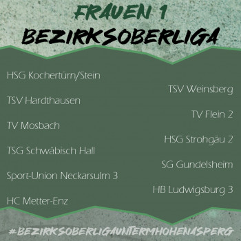 Nicht anders ist die Verteilung der Alt-Bezirke in der Bezirksoberliga der Frauen. Neben der ersten Frauenmannschaft treten noch der HC Metter-Enz, die HSG Strohgäu 2 und die HB Ludwigsburg 3 aus Enz-Murr an. Die weiteren acht Mannschaften waren bisher im Bezirk Heilbronn-Franken angesiedelt: die HSG Kochertürn/Stein, der TSV Hardthausen, der TV Mosbach, die TSG Schwäbisch Hall, die Sport-Union Neckarsulm 3, der TSV Weinsberg, der TV Flein 2 und die SG Gundelsheim.