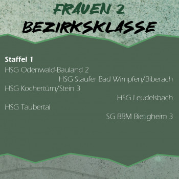 Die Bezirksklasse der Frauen wird in zwei Siebner-Staffeln ausgespielt. Die zweite Frauenmannschaft trifft dabei auf die HSG Odenwald-Bauland 2 (TSV Buchen, TV Hardheim und SPG Walldürn), die HSG Kochertürn/Stein 3, die HSG Taubertal (SG Bad Mergentheim, TV Dittigheim, TSV Tauberbischofsheim), die HSG Staufen Bad Wimpfen/Biberach, die HSG Leudelsbach und die SG BBM Bietigheim 3.