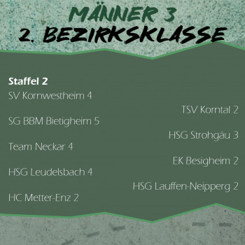 Zumindest für die dritte Männermannschaft bleiben die Fahrten zu den Auswärtsspielen zum größten Teil in den bekannten Bezirksgrenzen. Lediglich zur HSG Lauffen-Neipperg 2 müssen die Männer 3 in den alten Bezirk Heilbronn-Franken. Dazu kommen acht Enz-Murr-Vereine: SV Kornwestheim 4, SG BBM Bietigheim 5, Team Neckar 4, HSG Leudelsbach 4, HC Metter-Enz 2, TSV Korntal 2, HSG Strohgäu 3 und EK Besigheim 2.