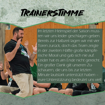 Fazit des Trainers: „Im letzten Heimspiel der Saison mussten wir uns leider geschlagen geben. Bereits zur Halbzeit lagen wir mit vier Toren zurück, doch das Team zeigte in der zweiten Hälfte große kämpferische Moral und gab sich nie auf. Leider hat es am Ende nicht gereicht.