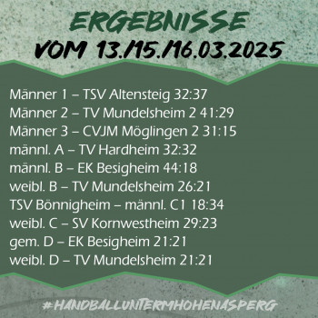 Die zweite Männermannschaft hat den dritten Sieg in Serie eingefahren. Gegen den TV Mundelsheim 2 setzten sich die Asperger mit 41:29 durch. Auch die Männer 3 gewannen zuhause: 31:15 gegen den CVJM Möglingen 2. Die männliche A-Jugend beendete die Saison mit einem 32:32 gegen den TV Hardheim. Während die gemischte D-Jugend am Donnerstag gegen den EK Besigheim 21:21 spielte, setzte sich die männliche B am Sonntag mit 44:18 gegen den EK durch. Ebenfalls einen Sieg und ein Unentschieden gab es gegen den TV Mundelsheim. Die weibliche B gewann 26:21 und das Spiel der weiblichen D-Jugend endete 21:21. Die männliche C1 konnte ihr Spiel beim TSV Bönnigheim mit 34:18 gewinnen und die weibliche C-Jugend besiegte den SV Kornwestheim mit 29:23.