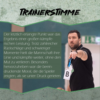 Fazit des Trainers: „Der letztlich erlangte Punkt war das Ergebnis einer großen kämpferischen Leistung. Trotz zahlreicher Rückschläge und schwieriger Momente hielt die Mannschaft ihre Linie und kämpfte weiter, ohne den Mut zu verlieren. Besonders hervorzuheben war die beeindruckende Moral, die die Spieler zeigten, als sie unter Druck gerieten.“