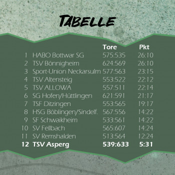 Die Lage in der Liga: Während die HABO Bottwar SG mit einem Sieg gegen Remshalden den Platz an der Spitze verteidigen konnte, hat sich die Sport-Union Neckarsulm durch den Punkt gegen Asperg an ALLOWA und Altensteig vorbei auf Platz drei geschoben. Alfdorf/Lorch/Waldhausen unterlag bei den TSF Ditzingen, die Platz sieben festigten. Im unteren Tabellenbereich gewannen die SF Schwaikheim bei der HSG Böblingen/Sindelfingen und zog mit der HSG gleich. Zudem spielten der SV Fellbach und die SG Hofen/Hüttlingen 25:25.