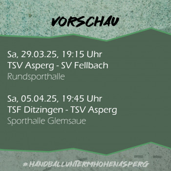 Für Asperg spielten: Eric Benke, Stefan Scheffel, Jan Gebauer (im Tor); Noah Mihatsch (2), Tim Reichert (2), Sebastian Margraf (2), Lou Mihatsch (8), Leon Tingler (3/2), Tom Schoch, Joshua Ibeazor (8), Daniel Kühn (7), Jannis Ostertag, Jan Raiser (5)