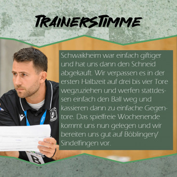 Fazit des Trainers: „Schwaikheim war einfach giftiger und hat uns dann den Schneid abgekauft. Wir verpassen es in der ersten Halbzeit auf drei bis vier Tore wegzuziehen und werfen stattdessen einfach den Ball weg und kassieren dann zu einfache Gegentore. Das spielfreie Wochenende kommt uns nun gelegen und wir bereiten uns gut auf Böblingen/Sindelfingen vor.“