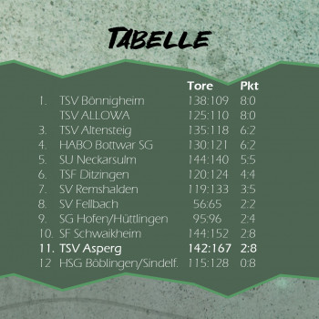 Die Lage in der Liga: Der TSV Bönnigheim und der TSV ALLOWA gehen in der Tabelle weiter vorne weg. Beide feierten am Wochenende den vierten Sieg im vierten Spiel. Im Verfolgerfeld konnten die Ditzinger mit dem zweiten Sieg in Folge ihr Punktekonto ausgleichen. Die Asperger rutschten durch die Niederlage vom neunten Platz wieder auf Rang elf zurück. Die HSG Böblingen/Sindelfingen bleibt als einziges Team ohne Pluspunkte.