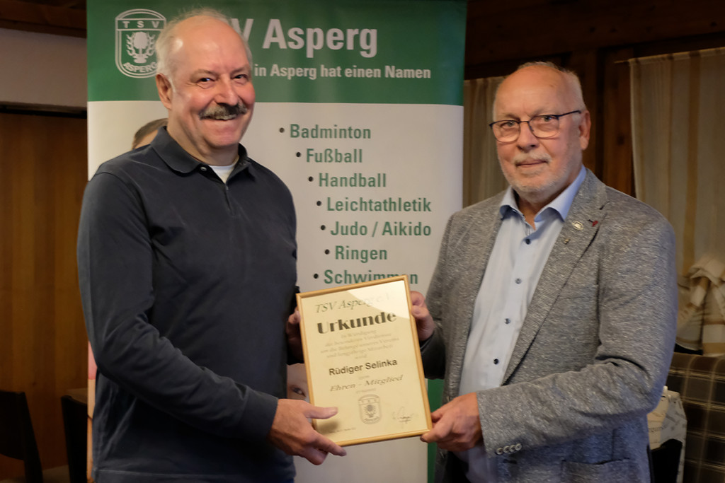 Auf der Jahreshauptversammlung am vergangenen Montag zeichnete der TSV Asperg erneut Ehrenmitglieder für ihre ganz besondere Verdienste im Verein aus. Auch die Handballabteilung hat nun ein Ehrenmitglied mehr. Rüdiger Selinka ist neben Werner Gruber, Martin Pfisterer, Bernd Suchanek und Uwe Engelhardt Ehrenmitglied Nummer fünf der Handballabteilung.