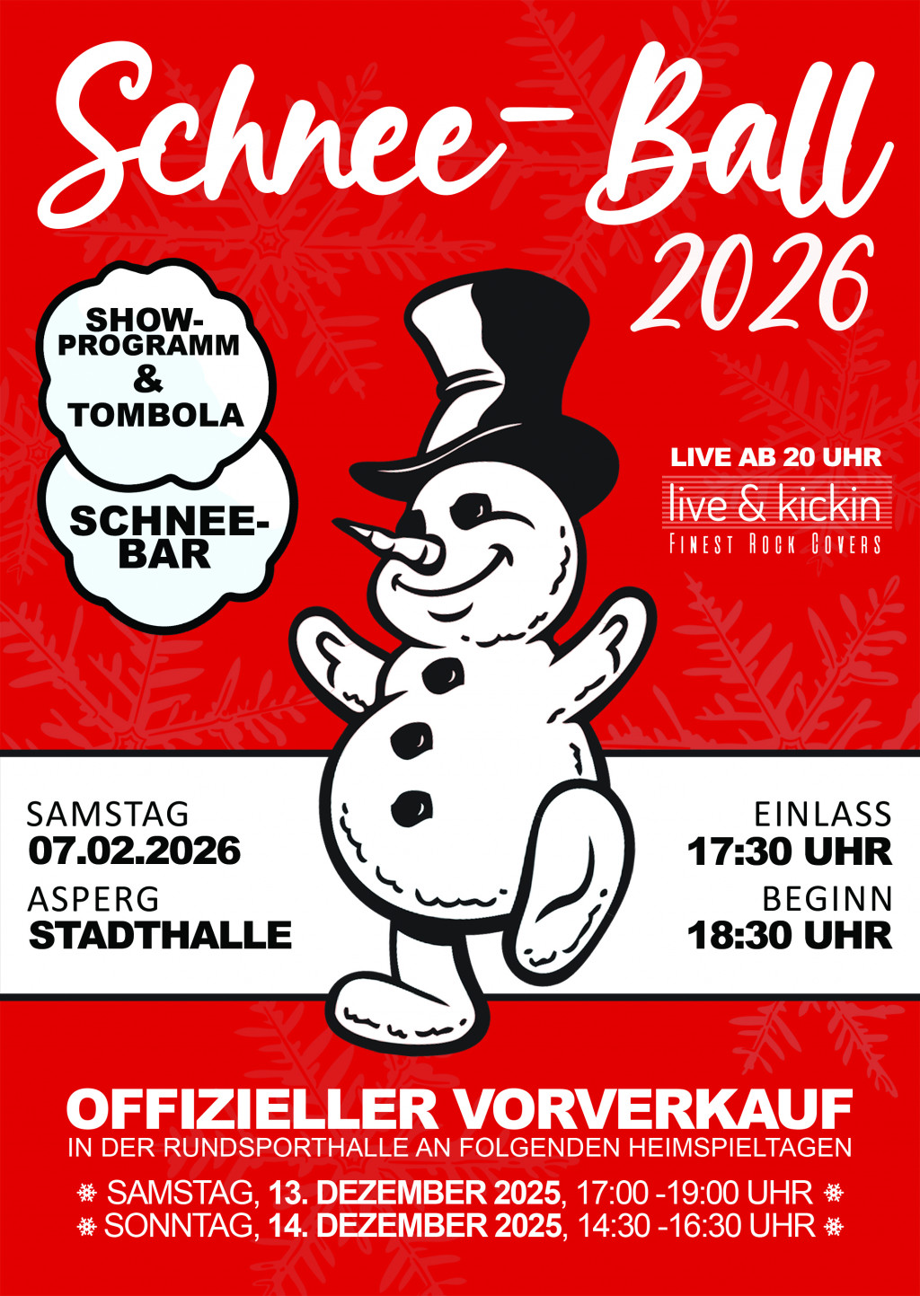 Wer sich den Schnee-Ball 2026 nicht entgehen lassen will, der hat an den beiden Heimspieltagen am 13. und 14. Dezember die Möglichkeit sich seine Karte zu sichern. Erwachsene zahlen 15 € und Kinder bzw. Jugendliche zwischen 6 und 16 Jahren kommen für 10 € zum Schnee-Ball.
