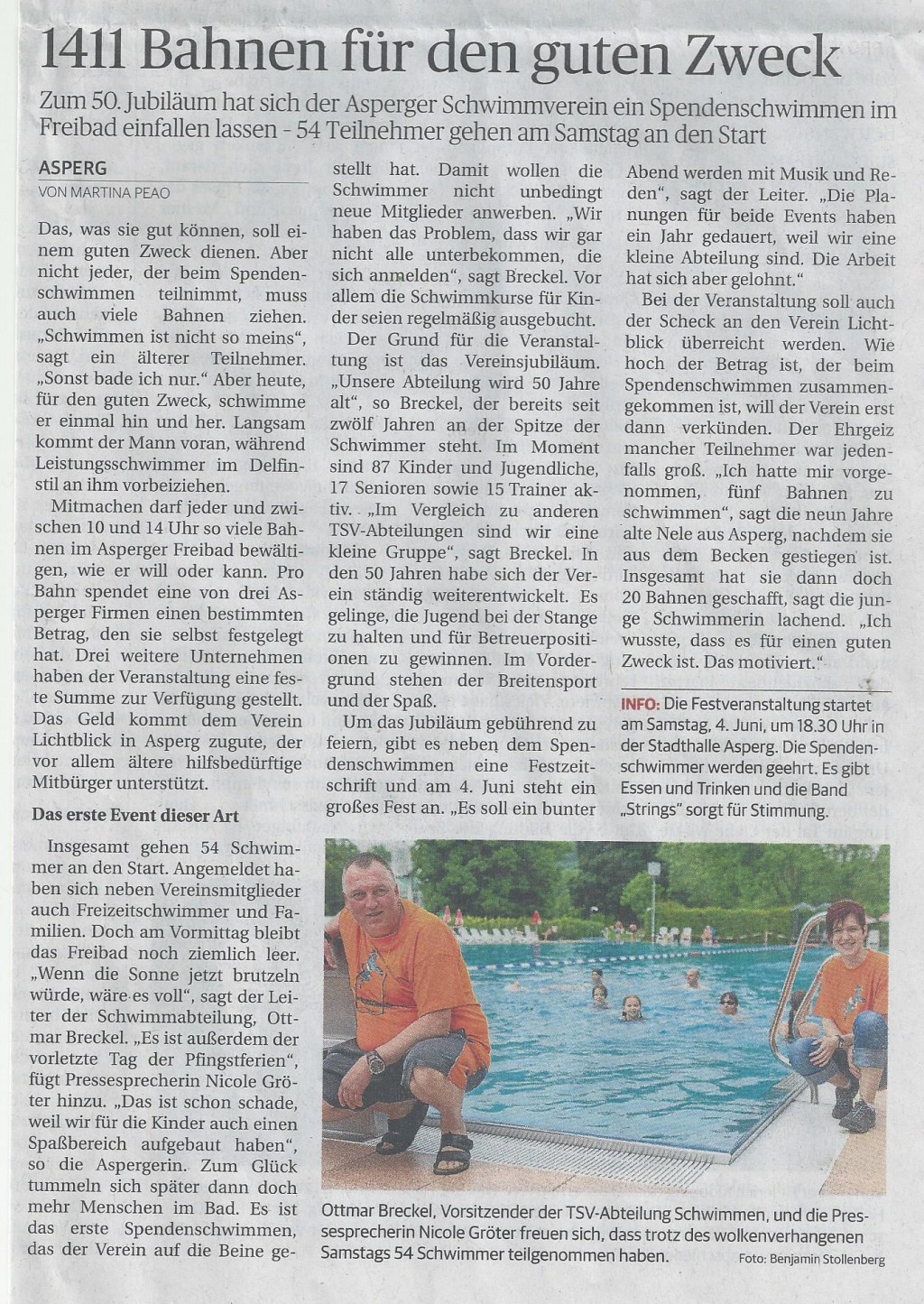 Schon eine Woche später im Juni stand der Festakt anlässlich unseres Jubiläums in der Stadthalle auf dem Programm. Nach einigen kurzweiligen Reden konnten wir den Spenden-Scheck über 1300,00€ an den Verein Lichtblick übergeben. Diese stattliche Summe war das Ergebnis des Spenden-Schwimmens. Im Anschluss übernahm die Band „Strings unplugged“ das Kommando und es wurde viel getanzt und gelacht. Die Tanzfläche und auch die Schwimmer-Bar waren zu jeder Zeit gut besucht und es herrschte eine super Stimmung. Nochmals vielen Dank an alle Gäste und Freunde der Schwimmabteilung für ihr kommen, an alle Helfer und an die Band für die super Stimmung an diesem Abend. Ebenfalls noch einmal ein herzliches Dankeschön an den Verein Blende 81 Film – und Fotofreunde Asperg e.V., der an beiden Wochenenden unser Abteilungs-Jubiläum in Bildern festgehalten hat. Auch die LKZ berichtete mehrmals über unser Jubiläum.