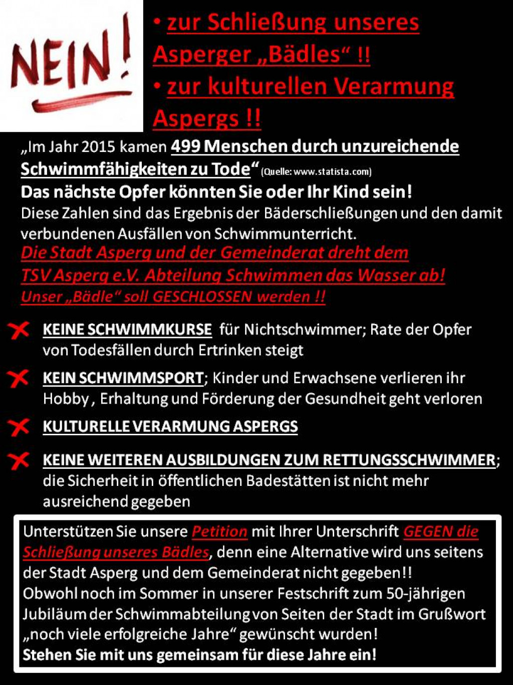 „Rettet das Bädle“ und „Kinder müssen Schwimmen lernen – auch in Asperg“ sind unsere Leitsprüche.