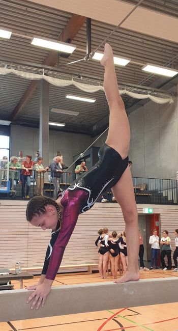 Das dritte Gerät war der Balken, für viele das Zittergerät, an dem sich auch bei unserer Mannschaft die Aufregung zeigte. An den Start gingen Cristina, Sarah, Greta, Felicia und Emiliana. Trotz der Aufregung hat Emiliana Kircher mit Ihrer Wertung die 9. beste Übung aus allen Mannschaften erreicht.